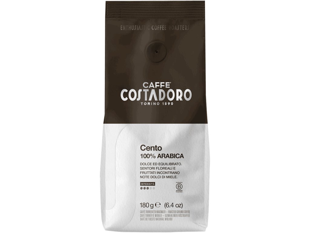 Café moulu pour cafetière moka Costadoro Cento est un nouveau mélange de café moulu pour un usage domestique, idéal pour la préparation dans une cafetière moka, 100% Arabica de haute qualité.