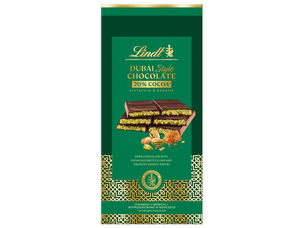 Découvrez les saveurs raffinées de Dubaï avec le chocolat Lindt. Ce chocolat noir d'exception allie la douceur onctueuse des pistaches au croquant unique des fibres traditionnelles du kadayif arabe. L'alliance de cette délicatesse crémeuse et de cette texture croquante crée un plaisir harmonieux et exclusif.