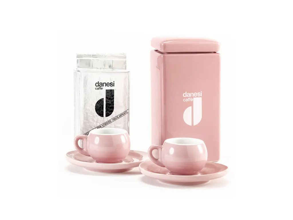 Coffret Duo Plus Danesi Rose - Café foncé en cassette 250 g + 2 tasses et 2 soucoupes - rose