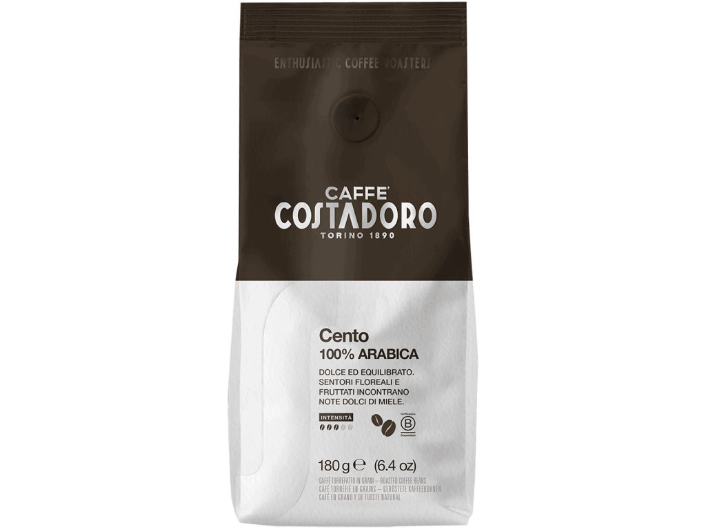 Les grains de café torréfiés Costadoro Cento sont un nouveau mélange de grains de café pour un usage domestique, 100% Arabica de haute qualité, désormais disponible en sacs pratiques de 180 g.