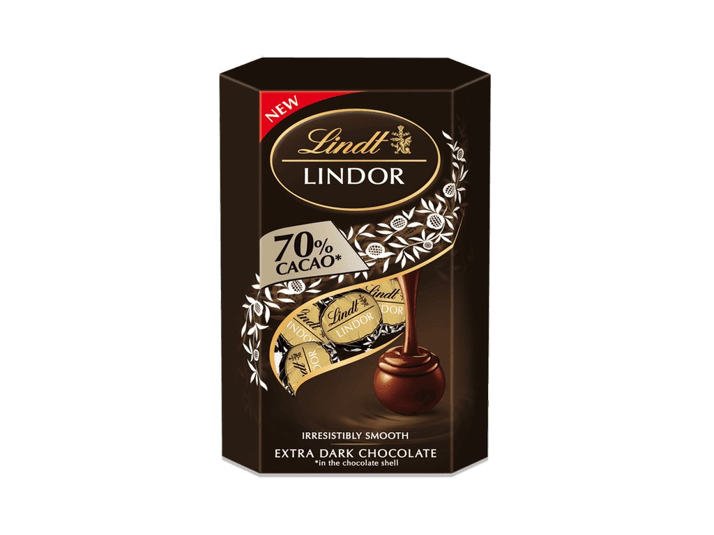 Vos pralines au chocolat noir Lindor préférées sont désormais enveloppées d'un chocolat à 70 % de cacao encore plus raffiné. Essayez Lindor Noir 70 % : des pralines irrésistiblement onctueuses et à la véritable intensité cacaotée. Un vrai régal. À conserver au sec et à l'abri de la chaleur.