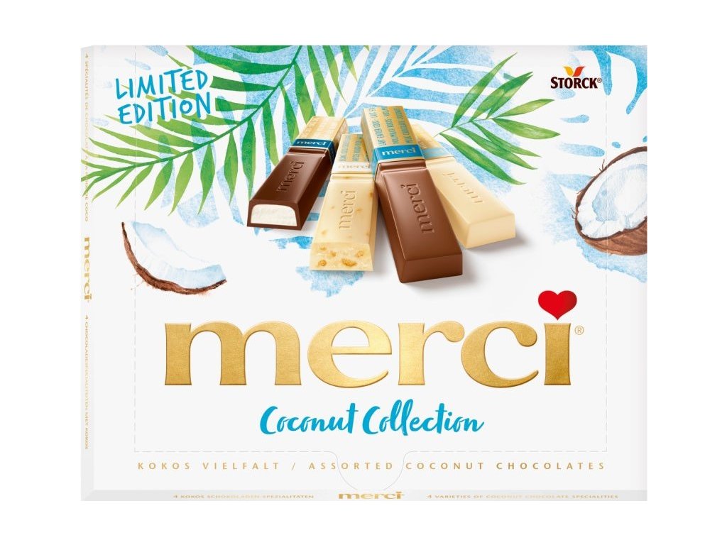 - Chocolat blanc fourré à la noix de coco et aux amandes.
